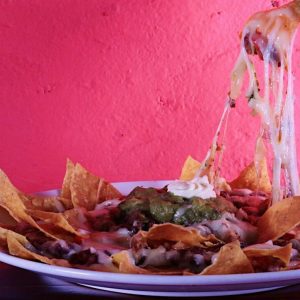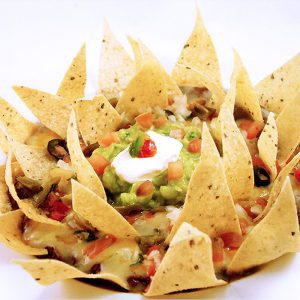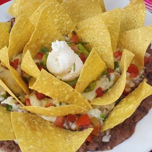 Tortilla Chips on top Refried Beans, Melted Cheese, Tomatoes, Guacamole and Sour Cream