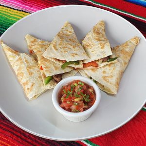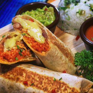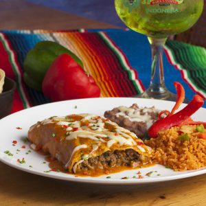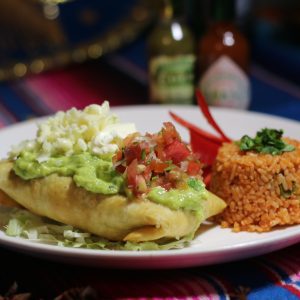 Flour Tortilla stuffed with Cheese, Refried Beans and your choice of filling, Served with Mexican Rice