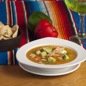 Made from tender chunks of chicken, hearty vegetables, Chili peppers and Topped with crispy tortilla strips.