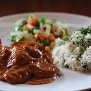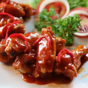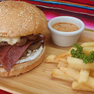 Marinated chicken cover with spicy chipotle sauce and Served with vegetables and choice : fries, mashed potato or mexican rice