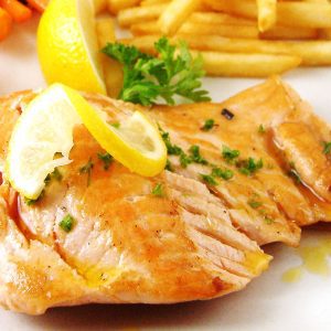 Grilled Salmon fish and Served with vegetables and choice : fries, mashed potato or mexican rice
