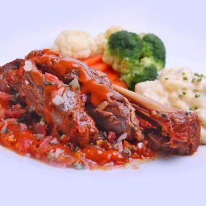 Braised lamb shank with tangy orange sauce Served with mix vegetables and choice : fries, mashed potato or mexican rice