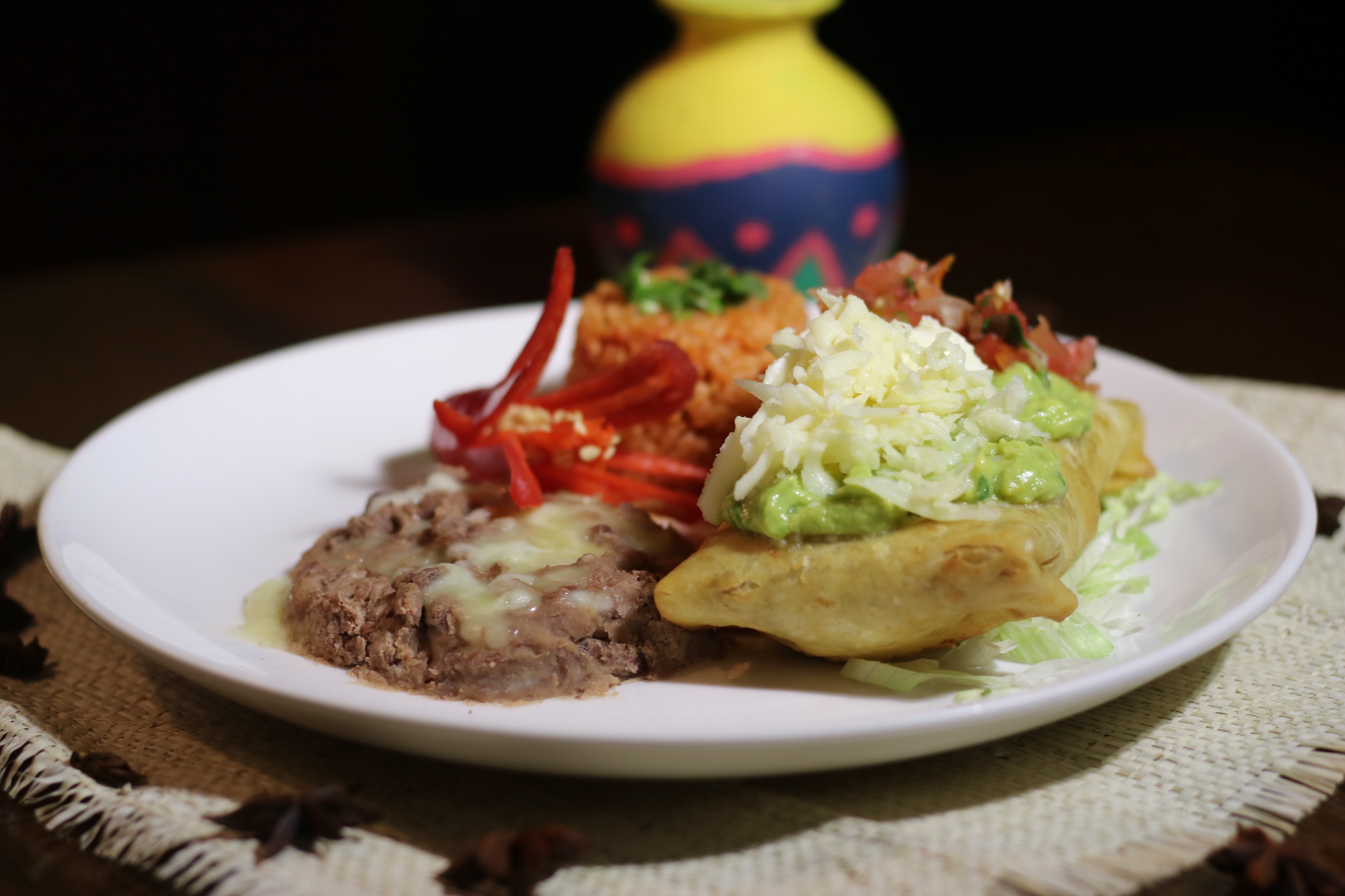 Flour Tortilla stuffed with Cheese, Refried Beans and your choice of filling, Served with Mexican Rice