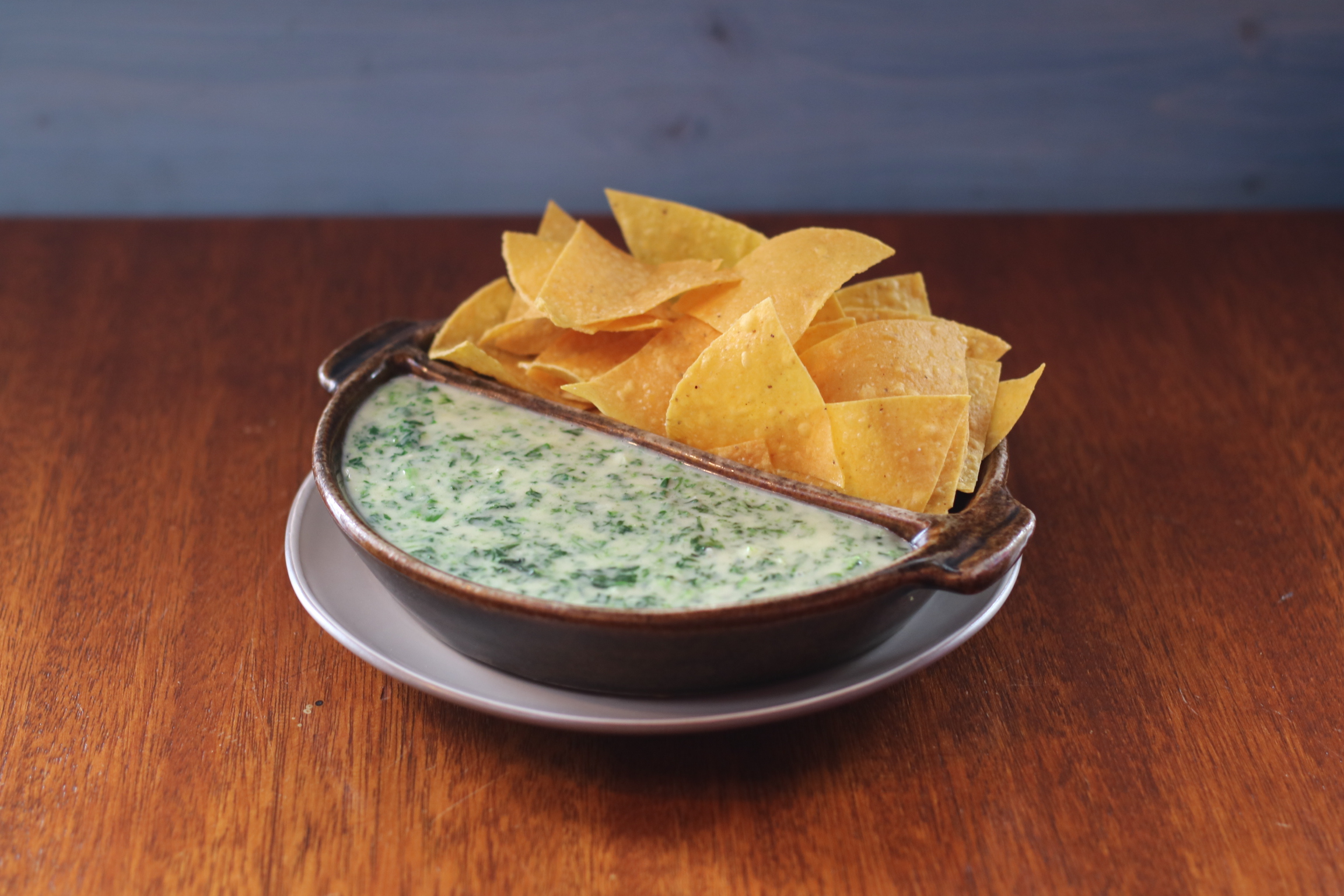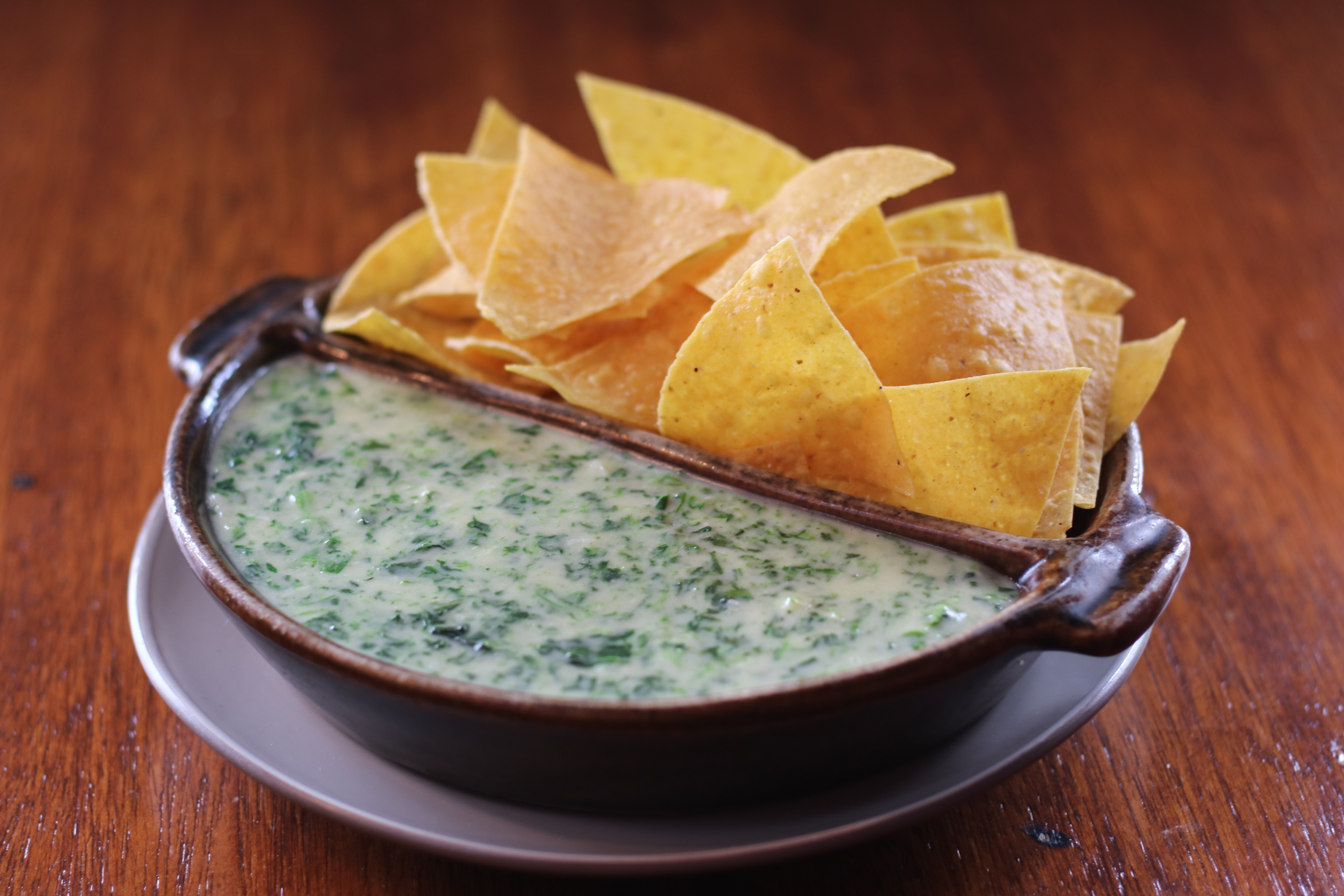 Made from blended spinach and Melted cheese and served with tortilla chips.