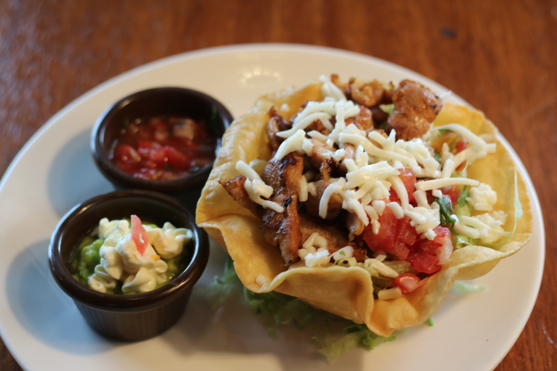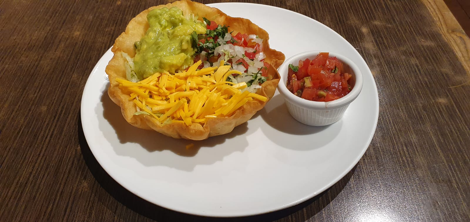 Crispy Tortilla Bowl, filled with Lettuce, Tomatoes, Refried Beans Cheese and Avocado